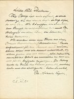 Zwei eigenhändige Briefe mit Unterschrift (der zweite mit Zusatz "und die Leute vom Barkenhof"), jeweils 1 Seite, kl-4, W[orpswede] 26. 11. und 30. 12. 1920. - An Karl Jänichen. "... Ihr Brief hat mich erfreut, es sind wenige, die das was ich sagte so tief erfasste wie Sie. Wir kämpfen hier einen schweren Kampf in wirtschaftlicher Not und Bedrängnis von allen Seiten, von Seiten der 'Parteien' besonders. Wir werden nun um Ostern aus einer Bonner Versuchsschule (Scharrelmann) Kinder aufnehmen für den Sommer und müssen dann sehen was sich daraus entwickelt. Wir wissen genau was wir wollen, aber haben noch unendliche Arbeit an uns selber zu tun um uns für die Aufgabe zu festigen. Den Vortrag sende ich Ihnen im Januar gedruckt, versichert[?] heute nur das einliegende ..." (26. 11.) "... Das war für uns eine grosse Freude - die Noten, Ihre tiefen rhytmischen Worte, dann das schöne Gebäck. Wir haben jetzt endlich eine Lehrerin für die Kleinen gefunden und so beginnt langsam der Aufbau. Ich habe jetzt eine wunderbare Aufgabe, male und schnitze unser[e] Räume ..." (30. 12.) - Faltspuren.